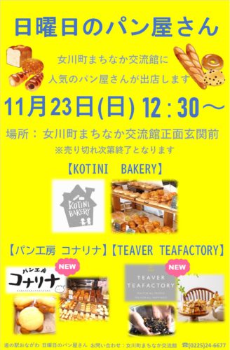 11月23日(日)12:30~(まち交・正面玄関前) 「日曜日のパン屋さん」を開催致します 。